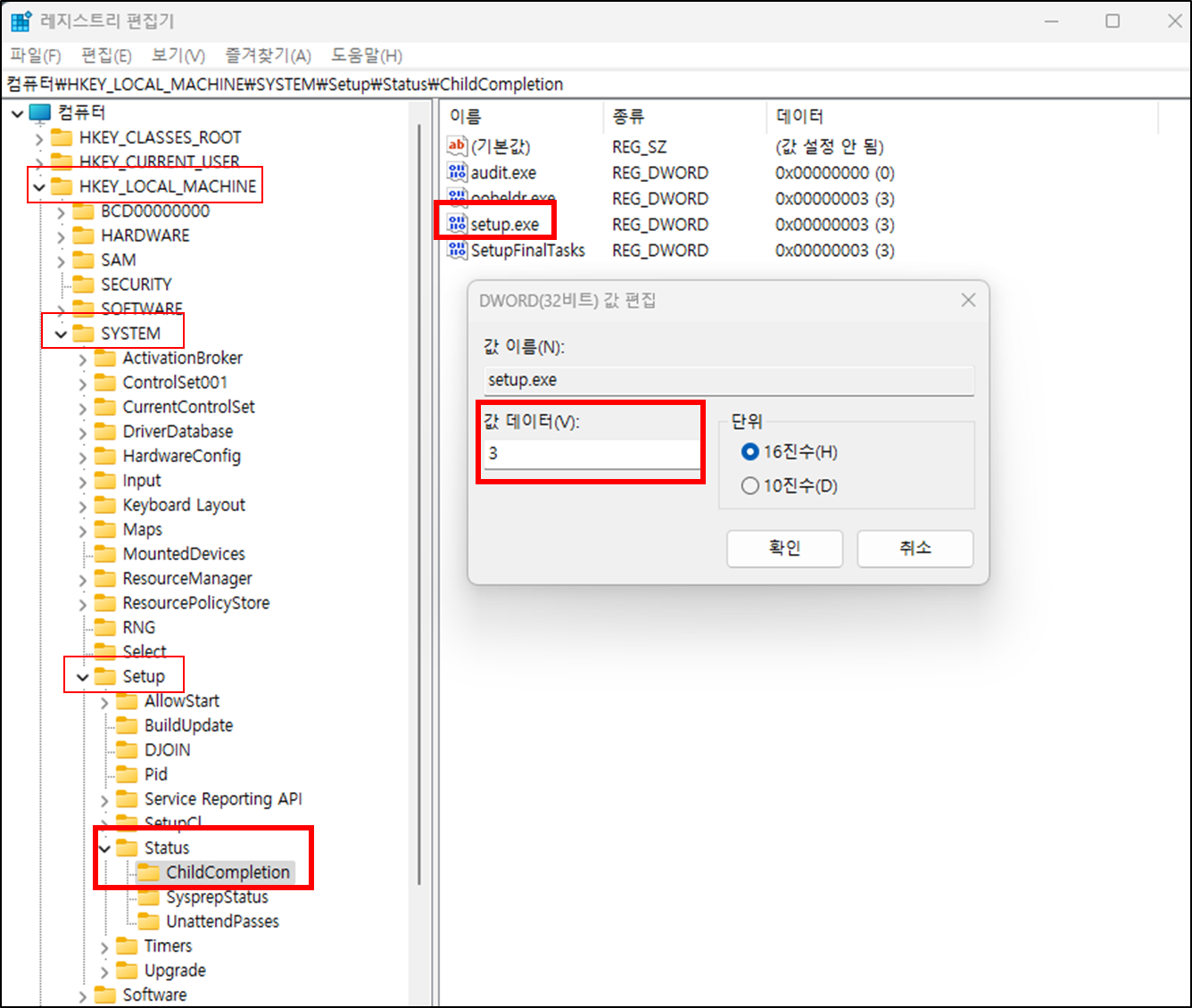 3) setup.exe 클릭후 Value data를 3으로 수정 -> 확인 클릭